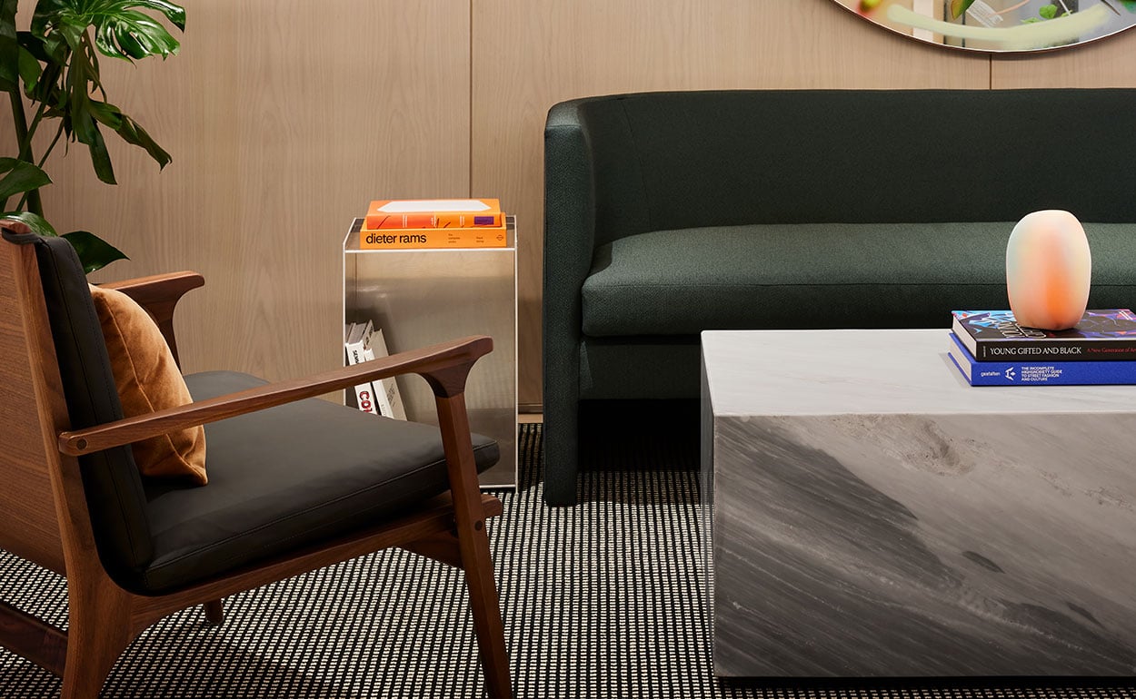 In the lounge space, you will find two other custom rugs made especially for BentallGreenOak. Häggå Dots, in black and white, and Tiles - block in a deep green rug with an over-tufted square accent pattern which make the room feel welcoming and encourage employees to sit and connect with one another.