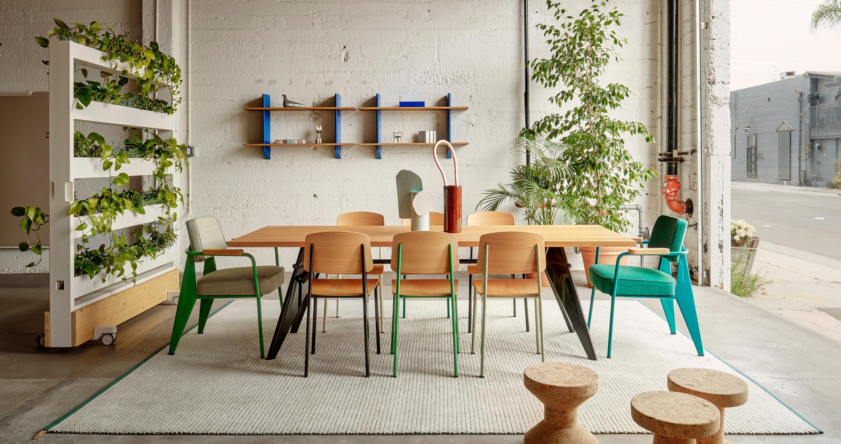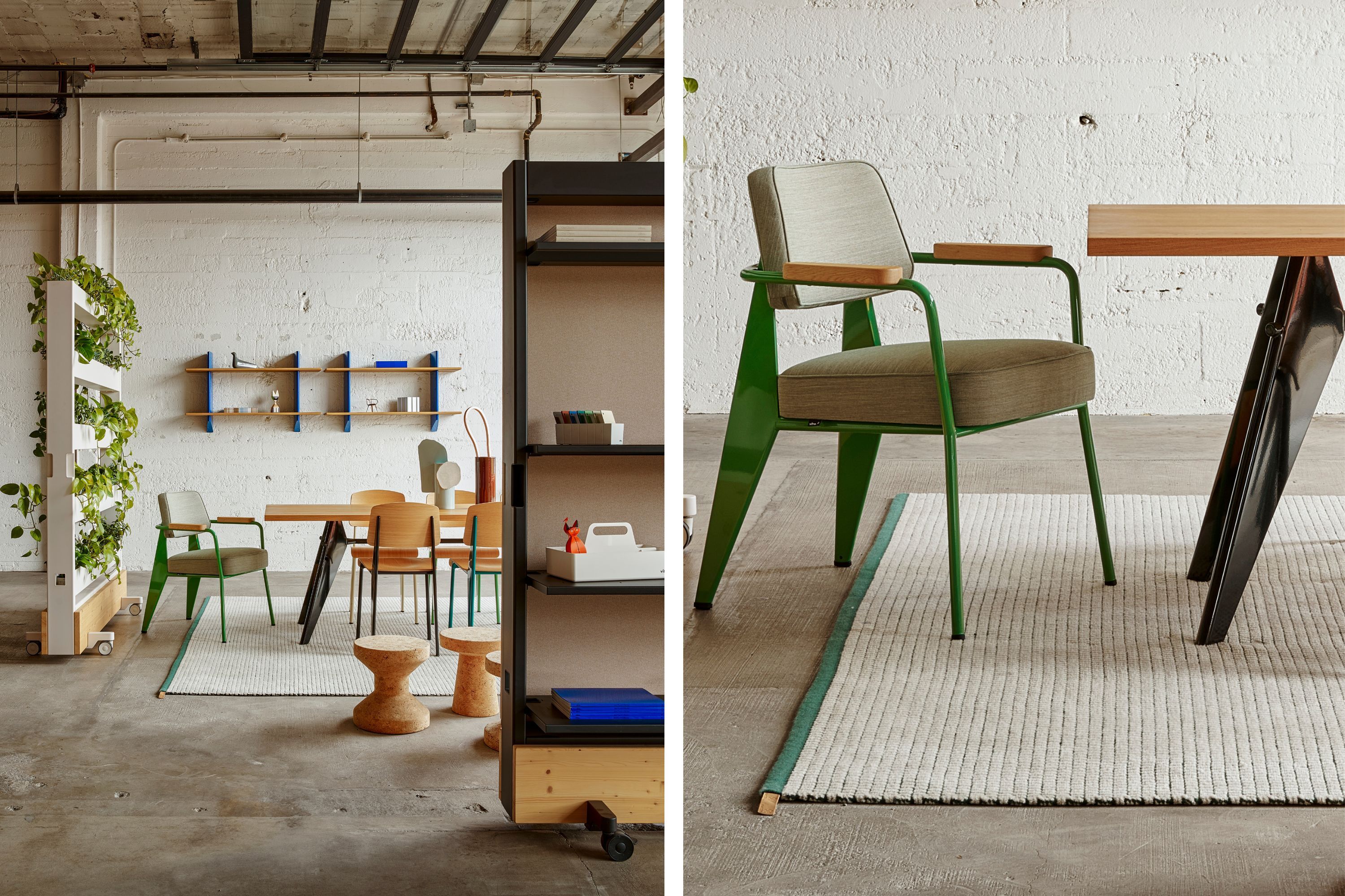 In 2022, Vitra reissued the powder-coated metal finishes for Jean Prouvé’s pieces – a nod to the lasting influence of the French designer. Vitra’s LA showroom celebrated this launch with a fresh installation where this color story is given room to unfold alongside Kasthall rugs that offer softness and tactile contrast to the overall design narrative.